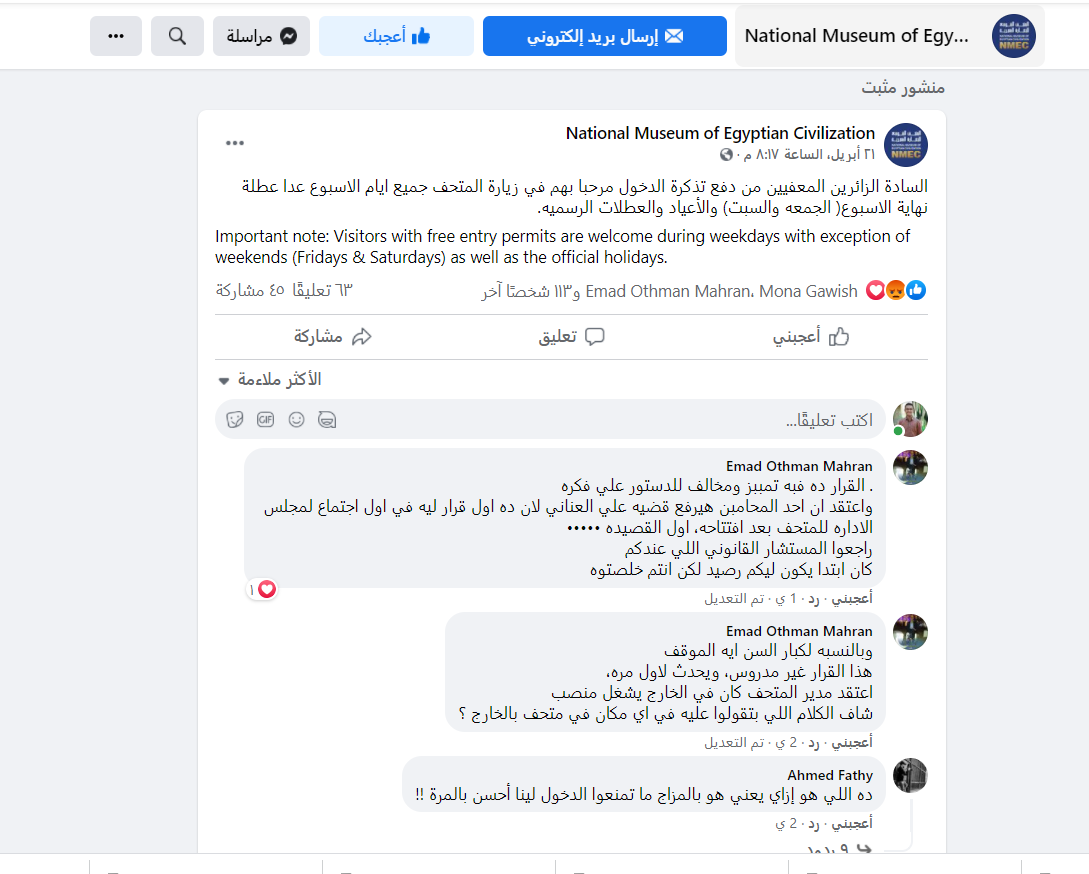 وذكر المتحف على صفحته الرسمية بموقع التواصل الاجتماعي، فيس بوك قائلا: "مرحبا بهم في زيارة المتحف جميع أيام الأسبوع، عدا عطلة نهاية الأسبوع ”الجمعة والسبت" والأعياد والعطلات الرسمية".