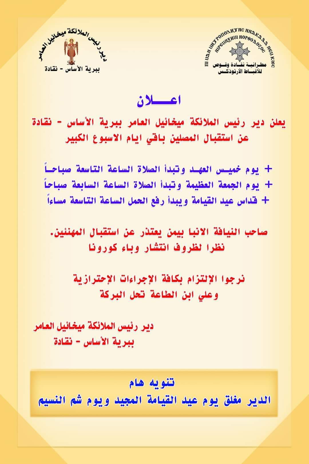 أعلن دير رئيس الملائكة ميخائيل العامر ببرية الأساس بمركز نقادة جنوبي قنا، عن استقبال المصلين باقي أيام الأسبوع الكبير، مع اعتذار الأنبا بيمن، عن استقبال المهنئين، بسبب فيروس كورونا المستجد.