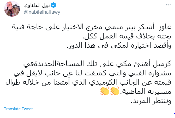 وكتب الحلفاوي تغريدة، عبر حسابة الرسمي بموقع التغريدات القصيرة "تويتر"، مغردًا: "عاوز أشكر بيتر ميمي مخرج الاختيار، على حاجة فنية بحتة بخلاف قيمة العمل ككل".