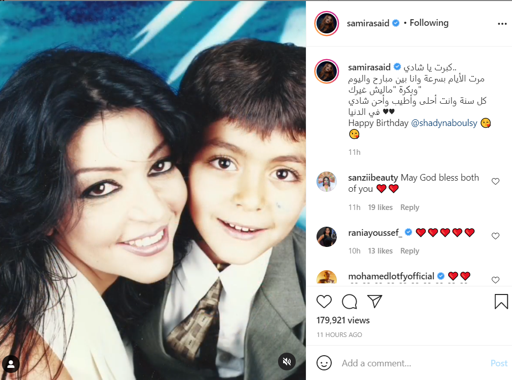 ونشرت سميرة سعيد، الفيديو عبر حسابها الرسمي على موقع تبادل الصور والفيديوهات القصيرة "انستجرام"، وظهرت وهي مبتسمة مع نجلها وهو في مرحلة الطفولة، وكتبت عليها " كبرت يا شادي ومرت الأيام بسرعة وأنا بين إمبارح واليوم وبكرة ماليش غيرك، كل سنة وأنت طيب أحلى وأطيب وأحن شادي بالدنيا".