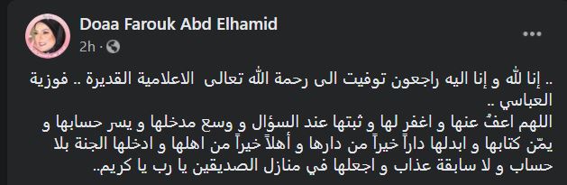 وعبّر العديد من أصدقاء ومحبي فوزية العباسي عن حزنهم لرحيلها، ومنهم الإعلامية دعاء فاروق التي كتبت عبر حسابها بفيس بوك: “إنا لله و إنا اليه راجعون توفيت إلى رحمة الله تعالى الإعلامية القديرة فوزية العباسي.. اللهم اعفُ عنها واغفر لها وثبتها عند السؤال ووسع مدخلها ويسر حسابها ويمّن كتابها وأبدلها دارًا خيرًا من دارها وأهلًا خيرًا من أهلها، وأدخلها الجنة بلا حساب ولا سابقة عذاب واجعلها في منازل الصديقين يا رب يا كريم".