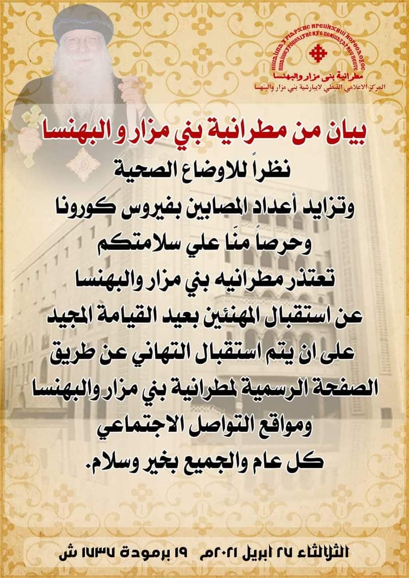 وقالت المطرانية في بيان أصدرته اليوم: “نظرًا للأوضاع الصحية وتزايد أعداد المصابين بفيروس كورونا وحرصًا منا على سلامتكم، تعتذر مطرانية بني مزار والبهنسا بمحافظة المنيا، عن استقبال المهنئين بعيد القيامة المجيد، على أن يتم استقبال التهاني عن طريق الصفحة الرسمية للمطرانية ومواقع التواصل الاجتماعي”.