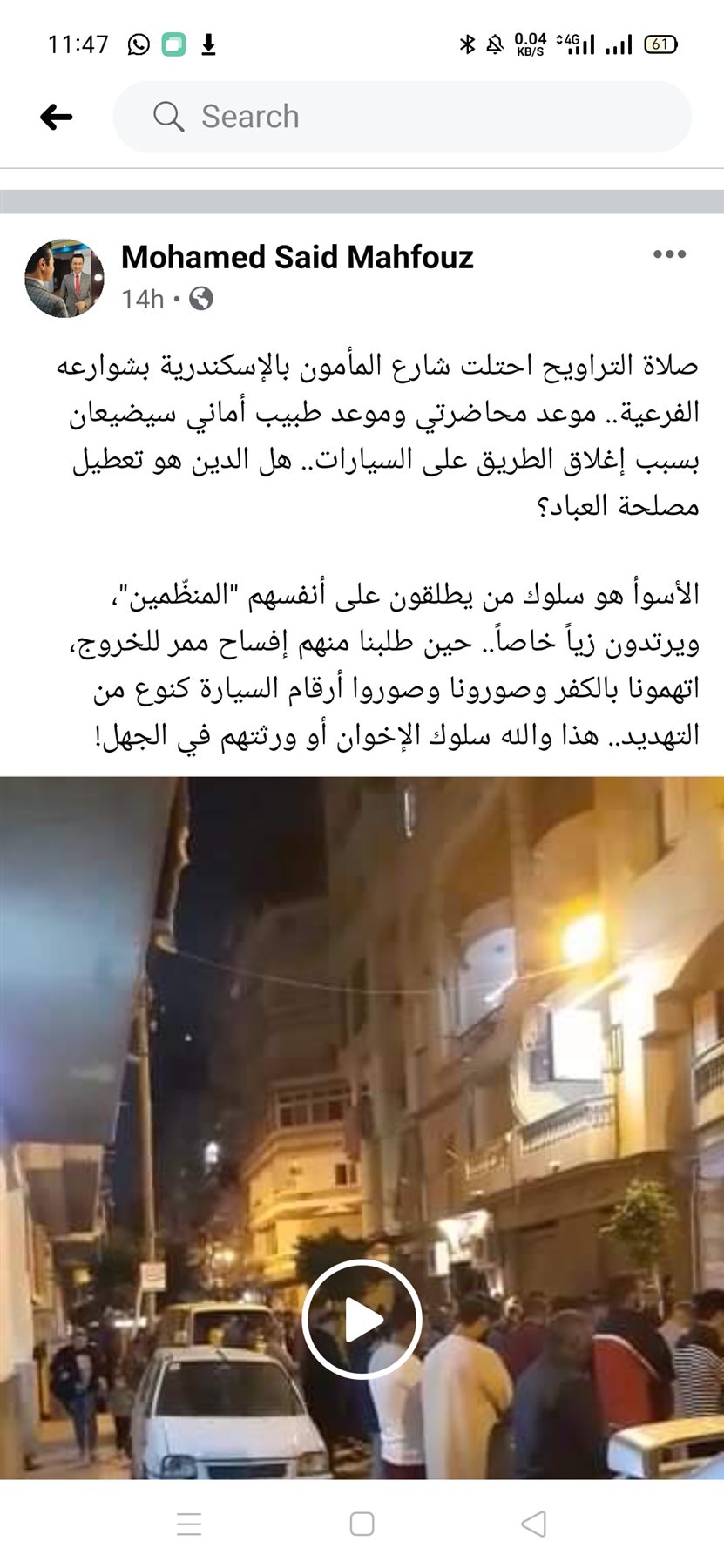 اتهم المنظمين بالإخوان.. جدل سكندري بعد نشر إعلامي فيديو ينتقد غلق شارع بسبب صلاة التراويح