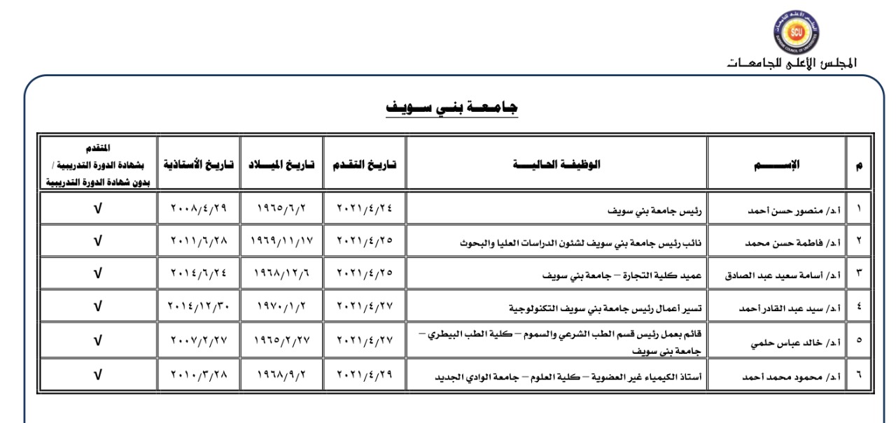 وأشار المجلس الأعلى للجامعات، إلى أن ذلك يأتي بعد صدور قرار وزير التعليم العالي والبحث العلمي ورئيس المجلس الأعلى للجامعات رقم (293) بتاريخ 27/1/2021، والمنشور بالجريدة الرسمية في السبت الموافق 30 يناير 2021 ، بشأن إعادة تشكيل اللجان المختصة بترشيح رؤساء الجامعات وعمداء الكليات والمعاهد وتنظيم عملها، وإجراءات وشروط الترشح ومعايير المفاضلة، وكذا القرار الوزاري رقم (1065) بتاريخ 22/3/2021 بشأن تشكيل اللجنة المختصة بترشيح رؤساء الجامعات.