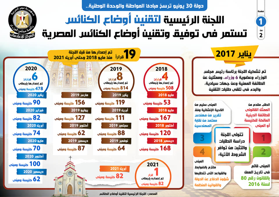 وفي هذا الصدد، نشر المركز الإعلامي لمجلس الوزراء، تقريراً تضمن إنفوجرافات تسلط الضوء على استمرار اللجنة الرئيسية لتقنين أوضاع الكنائس في توفيق وتقنين أوضاع الكنائس المصرية.