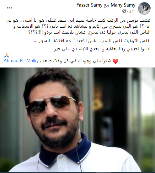 ونشرت ما هي صورة له، عبر حسابها الرسمي بموقع التواصل الاجتماعي "فيس بوك"، وعلقت عليها قائلة: “عشت يومين من الرعب كنت حاسهة فيهم إني بفقد عقلي، هو أنا إمتى.. هو في إيه؟؟ هو اللي بيصرخ من الألم ويتشاهد ده أنت تاني؟، هو الإسعاف والناس اللي بتجري حوليا دي بتجري عشان تلحقك أنت بردو؟”.