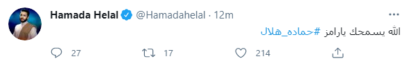 وكتب حمادة هلال عبر حسابه الشخصي على موقع التغريدات القصيرة “تويتر”: “الله يسامحك يا رامز.. حمادة هلال”.