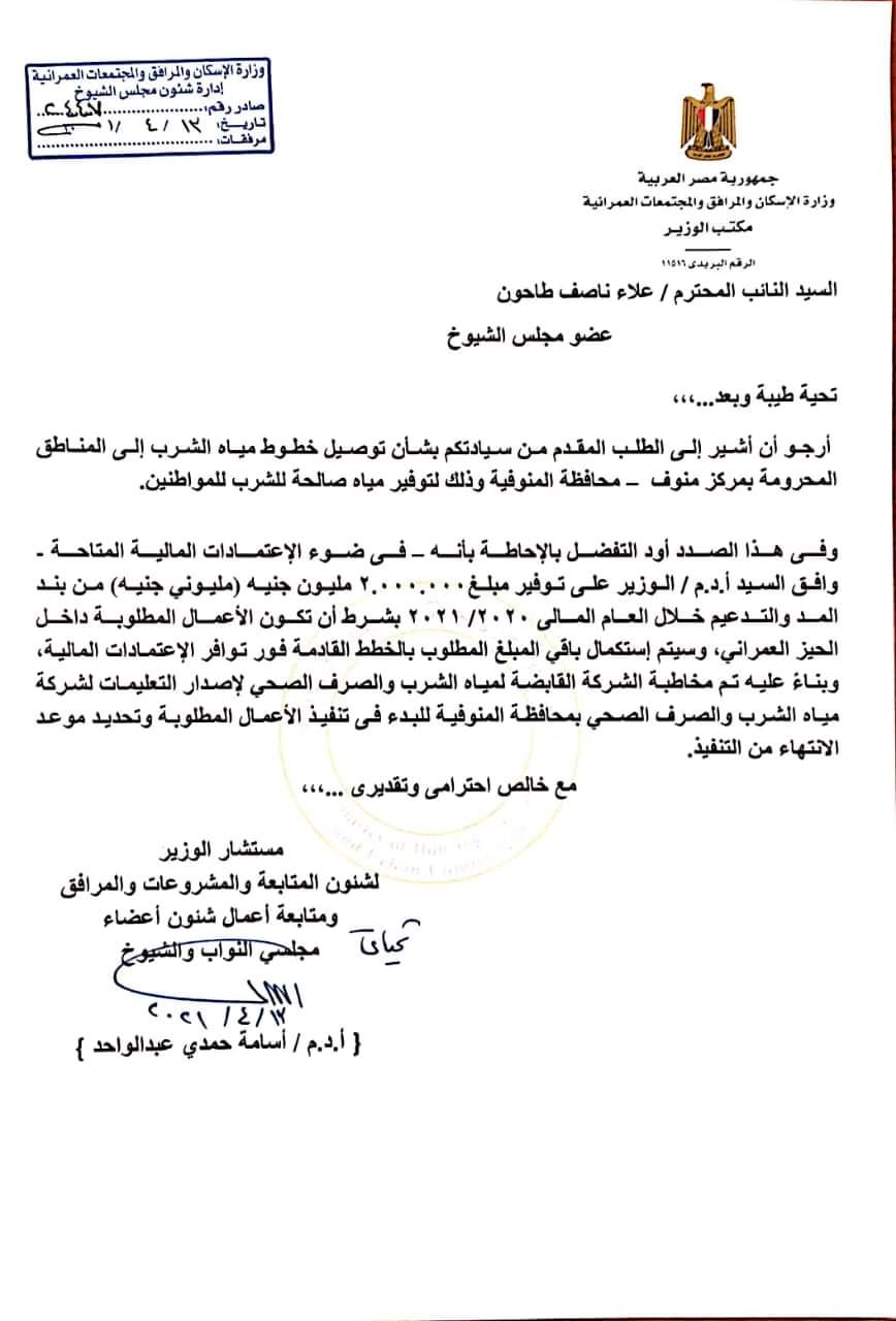 الإسكان تدعم منوف بـ2 مليون جنيه لمد خطوط المياه بالمناطق المحرومة (مستند)
