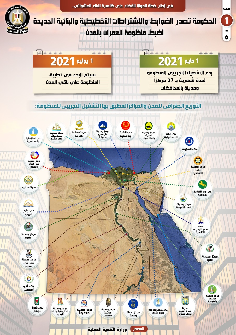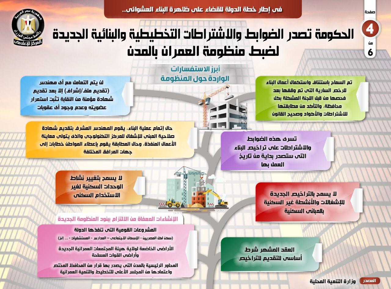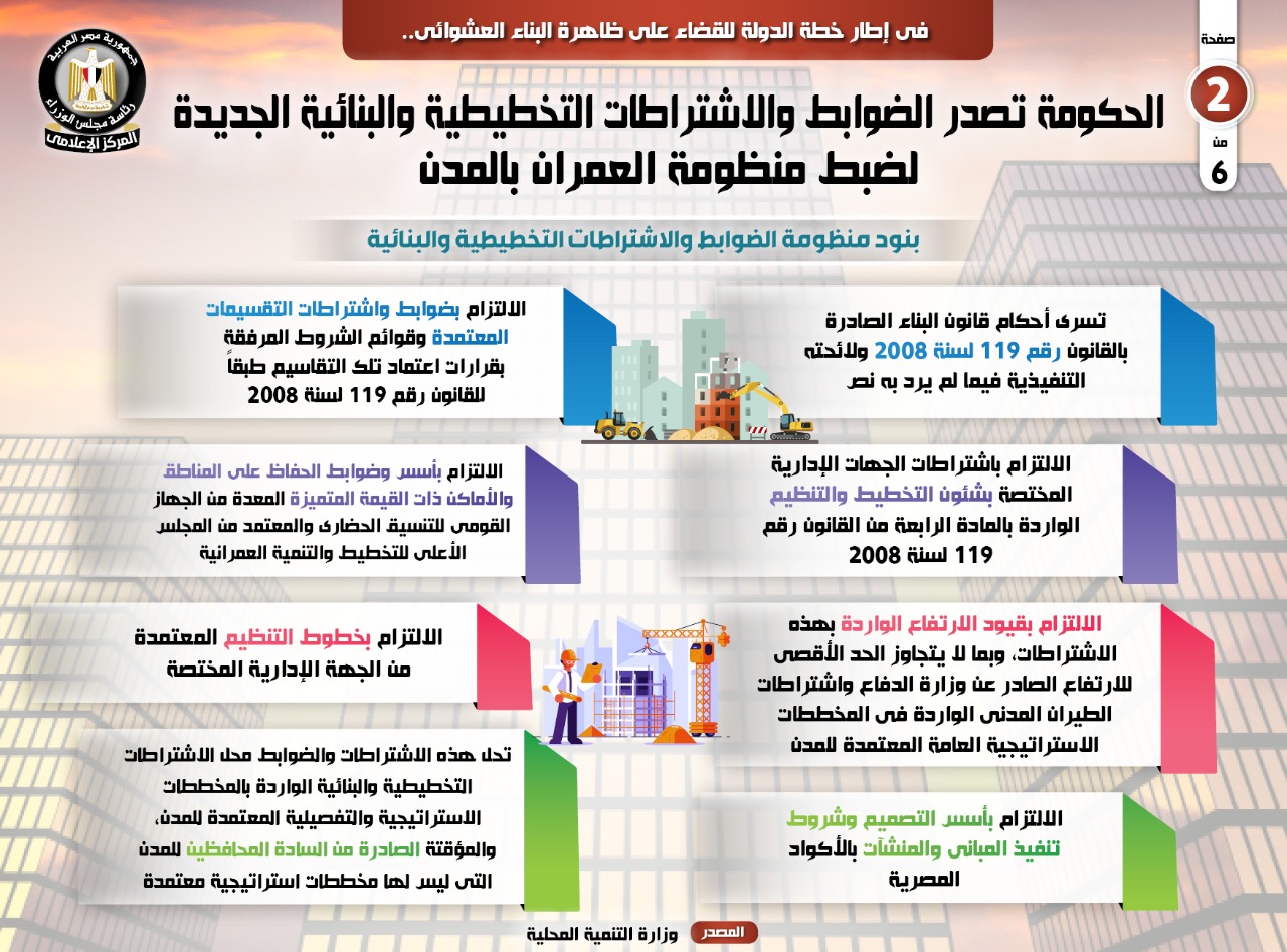 وفي هذا الصدد، نشر المركز الإعلامي لمجلس الوزراء، تقريراً تضمن إنفوجرافات تسلط الضوء على الضوابط والاشتراطات التخطيطية والبنائية الجديدة التي أصدرتها الحكومة لضبط منظومة العمران بالمدن، وذلك في إطار خطة الدولة للقضاء على ظاهرة البناء العشوائي.