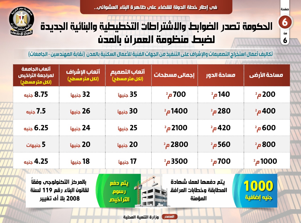 وفي حال مساحة الأرضي البالغة 1000 م2، أي مساحة الدور 700 م2، بإجمالي مسطحات 3500 م2، فتتمثل تكلفة تراخيص كل متر مسطح في 17 جنيهاً أتعاب التصميم، و18 جنيهاً لأتعاب الإشراف، و4.25 جنيه أتعاب الجامعة لمراجعة التراخيص.