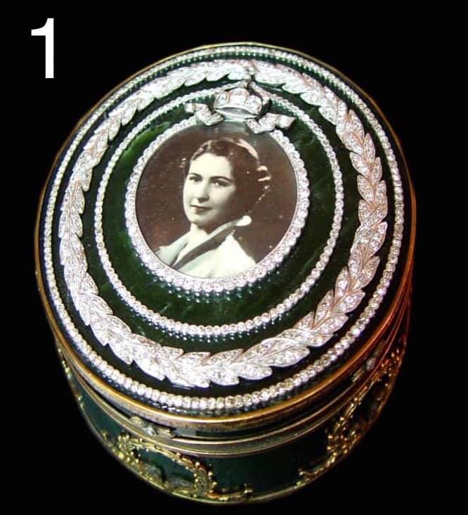 علبة مستديرة من الذهب والبلاتين والعقيق، مرصعة بالماس، يتوسط غطائها صورة بالمينا الملونة للملكة فريدة.
