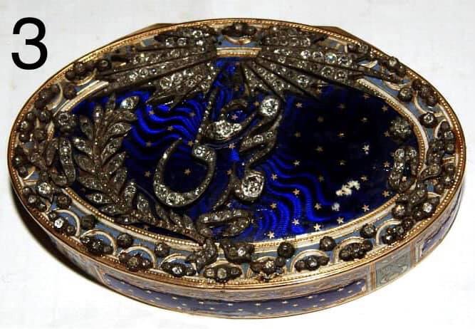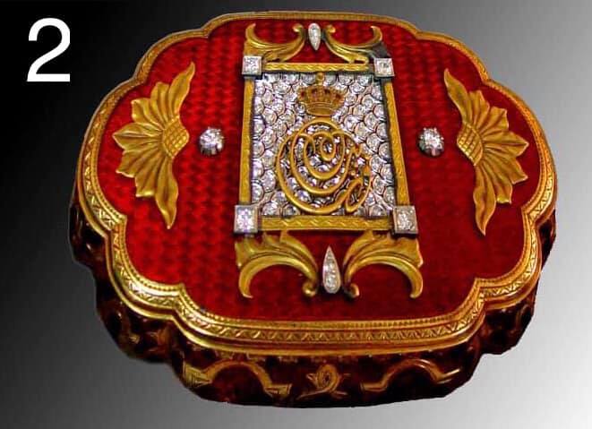 علبة نشوق بيضاوية من الذهب والفضة مموهة بالمينا الزرقاء، عليها حليات مرصعة بالماس، تحمل في وسط الغطاء اسم محمد علي باشا.