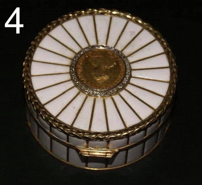 علبة أسطوانية من الذهب، محلاة بالمينا البيضاء، يتوسط الغطاء قطعة عملة نمساوية ذهبية إطارها مرصع بالماس، من مقتنيات الأميرة فوزية.