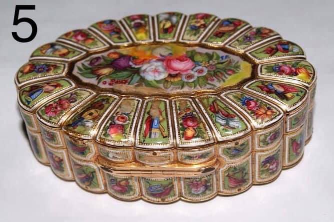 علبة نشوف بيضاوية من الذهب، مزينة بتابلوهات زهور وآلات موسيقية بالمينا الملونة، من مقتنيات إلهامي حسين باشا.