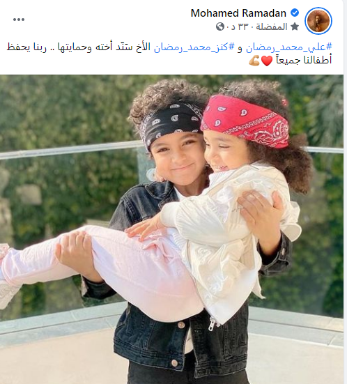 ونشر رمضان صورة لأبنائه، عبر حسابه الرسمي بموقع التواصل الاجتماعي "فيس بوك"، وعلق عليها قائلًا: "علي محمد رمضان وكنز محمد رمضان، الأخ سند أخته وحمايتها.. ربنا يحفظ أطفالنا جميعًا".