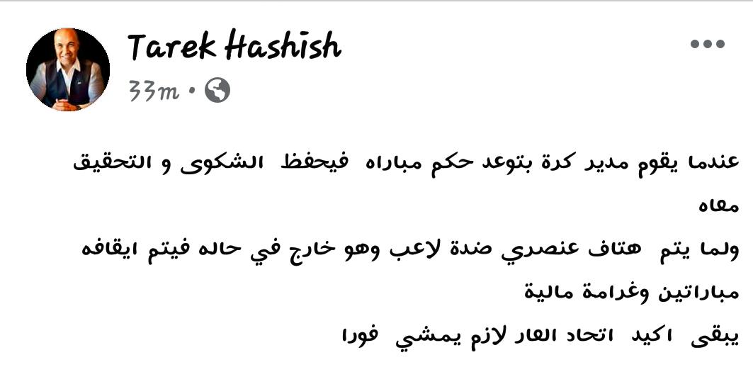 وكتب طارق حشيش عبر صفحته على فيس بوك: "عندما يقوم مدير كرة بتوعد حكم مباراة فيحفظ الشكوى والتحقيق معاه.. ولما يتم هتاف عنصري ضد لاعب وهو خارج في حاله فيتم إيقافه مباراتين وغرامة مالية.. يبقى أكيد اتحاد العار لازم يمشي فورا".