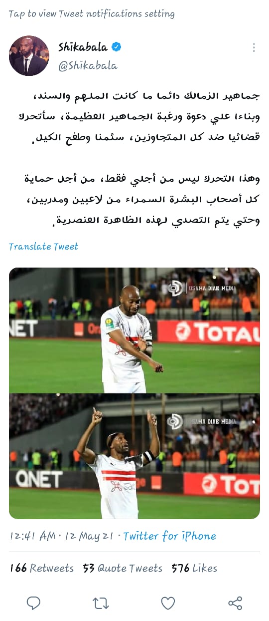 وأضاف شيكابالا: "هذا التحرك ليس من أجلي فقط، من أجل حماية كل أصحاب البشرة السمراء من لاعبين ومدربين، وحتى يتم التصدي لهذه الظاهرة العنصرية".