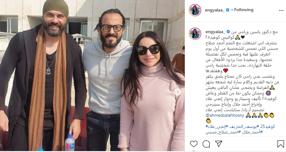 ونشرت إنجي علاء، صور من كواليس التصوير، عبر حسابها الشخصي على موقع تبادل الصور والفيديوهات القصيرة "انستجرام"، وعلقت: "بتشرف إني اشتغلت مع النجم أحمد صلاح حسني ومبسوطة بردود الأفعال عن حلقة النهاردة".