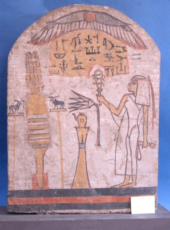 1- لوحة جنائزية لكاهنة حتحور فى منظر تقدمة للاله أوزير و يتوج اللوحة قرص الشمس المجنح، مصنوعة من الحجر الجيري وتعود إلى الدولة القديمة.