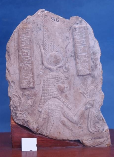 2- قطعة عليها إحدى الألوهيات ترتدى تاج حتحور ويتوجها ريشتى آمون و تمسك بكلتا يديها ثعابين وعقاب وتجلس على تمساح، وهذا المنظر يعبر عن الحماية، ومصنوعة من الحجر الجيري وتعود إلى العصر البطلمي.
