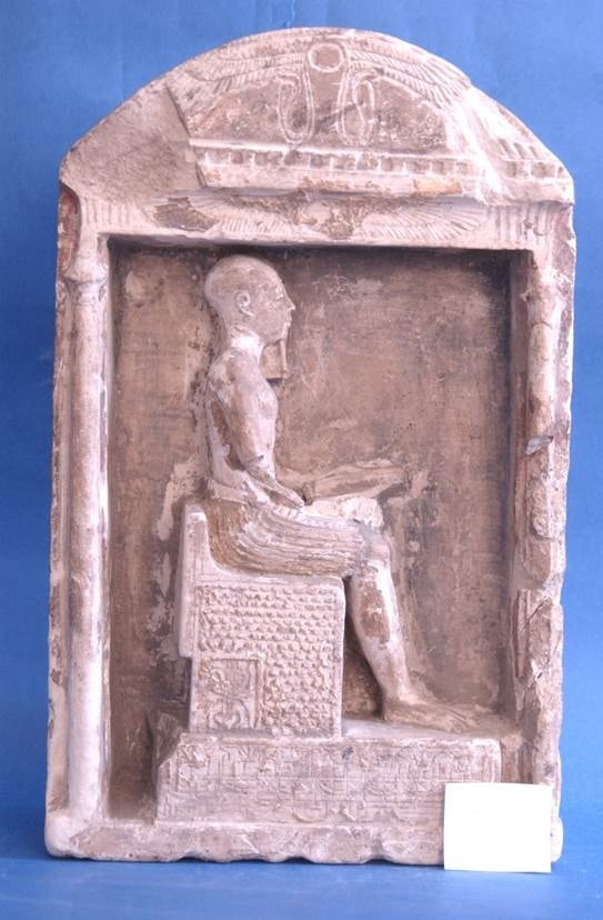 3- لوحة تمثل ايمحتب جالس على كرسي يرتدى لحية الألوهية و يفتح لفة بردى ويتوج اللوحة قرص الشمس المجنح، مصنوعة من الحجر الجيري، وتعود إلى العصر المتأخر.
