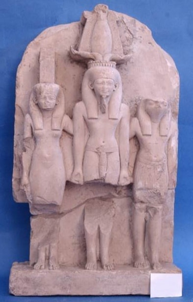 4- لوحة عليها نقش بالبارز يمثل الثالوث ايزيس على اليمين و حورس على يسار والملك ممثلا أوزير فى الوسط يرتدى تاج الآتف، ومصنوعة من الحجر الجيري وتعود إلى الدولة القديمة.