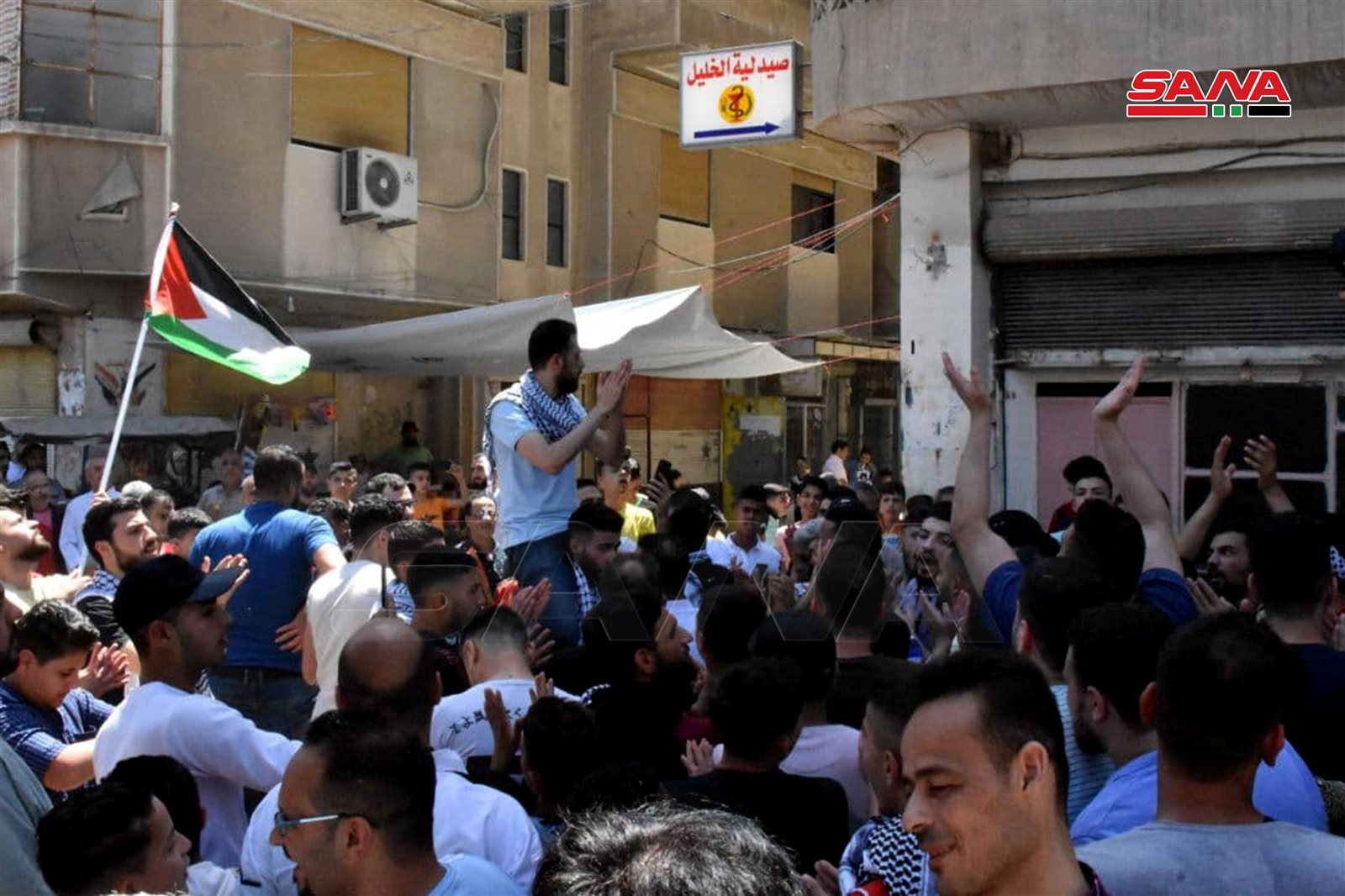 احتشد العشرات من أهالي حي العائدين في محافظة حماة السورية، اليوم الجمعة، نصرة لأهل فلسطين في القدس وغزة ضد العـدوان الإسرائيـلي المتواصل.
