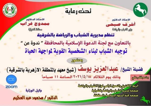 أعلن الدكتور ممدوح غراب، محافظ الشرقية، تنظيم مديرية الشباب والرياضة بإشراف الدكتور محمود عبد العظيم، وكيل وزارة الشباب والرياضة بالشرقية، بالتعاون مع لجنة الدعوة الإسلامية بالمحافظة، ندوة دينية لتوجيه الشباب لبناء الشخصية القوية لمواجهة أعباء الحياة.