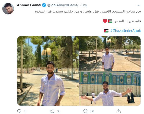 شارك المطرب الشاب أحمد جمال جمهوره بصور له من ساحة المسجد الأقصى، دعمًا للقضية الفلسطينية بعد الاعتداءات التي تعرض لها الفلسطينيون على يد قوات الاحتلال.