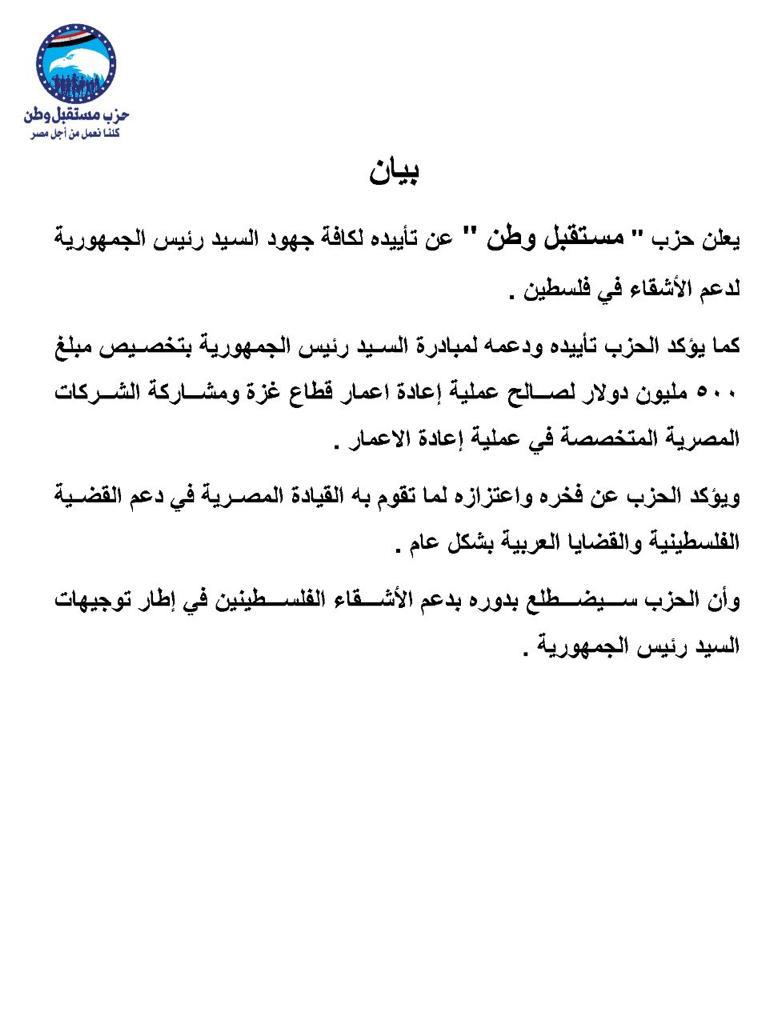 وأعرب حزب مستقبل وطن عن فخره واعتزازه لما تقوم به القيادة المصرية في دعم القضية الفلسطينية والقضايا العربية بشكل عام، وأن الحزب سيضطلع بدوره بدعم الأشقاء الفلسطينيين في إطار توجيهات رئيس الجمهورية.
