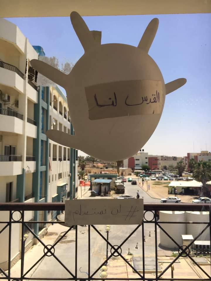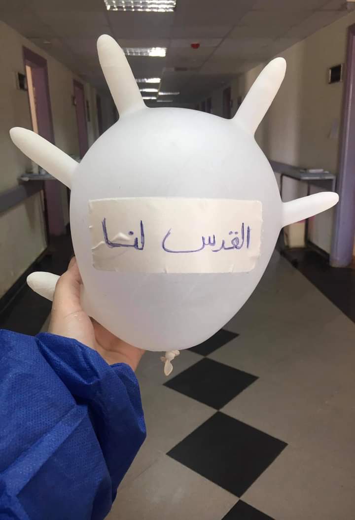 وعن فكرة الكتابة على القفازين، تقول: "كنت في العزل لوحدي ليلة العيد، ففكرت في طريقة أتضامن بيها مع الشعب الفلسطيني، وملقتش غير الجلافز، فكتبت عليه "القدس لنا" ولزقتها على الحيطان".