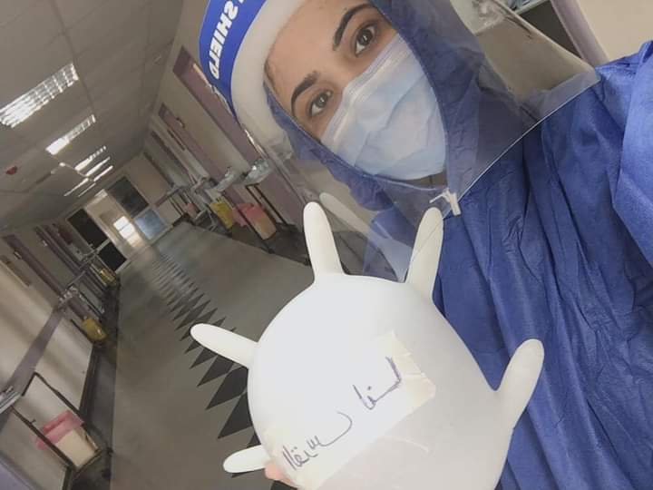 لم تجد أمامها طريقة أخرى لإظهار تضامنها مع الشعب الفلسطيني الذي ترجع أصولها إليه، لذا قررت الكتابة على القفاز الذي يشير إلى مهنتها.. آية النجار، ممرضة في مستشفى عزل العريش العام بشمال سيناء، وصاحبة الصورة الشهيرة المنتشرة على مواقع التواصل الاجتماعي.