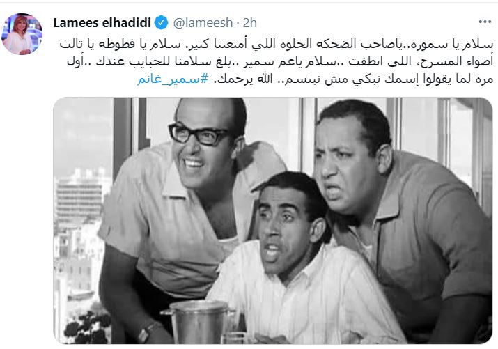 وكتبت الإعلامية لميس الحديدي، عبر صفحتها بموقع التواصل الاجتماعي "تويتر"،: "سلام يا سموره.. يا صاحب الضحكة الحلوة اللي أمتعتنا كتير. سلام يا فطوطة يا ثالث أضواء المسرح، اللي انطفت.. سلام يا عم سمير.. بلغ سلامنا للحبايب عندك.. أول مرة لما يقولوا اسمك نبكي مش نبتسم.. الله يرحمك".