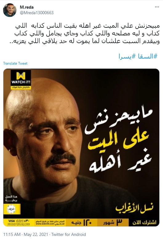 واستعان حساب باسم رضا، بصورة للفنان أحمد السقا من مسلسل نسل الأغراب، وكتب:" مبيحزنش علي الميت غير أهله بقيت الناس كدابة اللي كداب، و ليه مصلحة واللي كداب وجاي يجامل واللي كداب وبيقدم السبت عشان لما يموت له حد يلاقي اللي يعزيه".