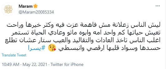 وقالت مريم:" ليش الناس زعلانة مش فاهمة عزت فيه وكثر خيرها وراحت تعيش حياتها كم واحد أمه وأبوه ماتوا وعادي الحياة تستمر اغلب الناس تأخذ العادات والتقاليد والعيب ستار عشان تطلع حسدها وسواد قلبها ارقصي وانبسطي".