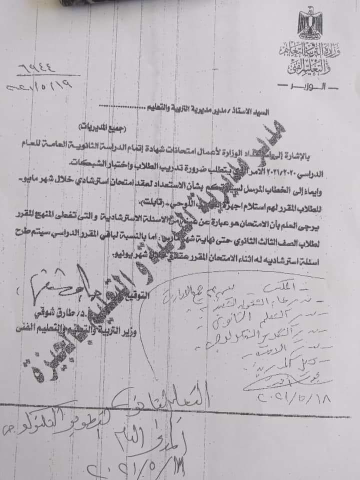 حصل “القاهرة 24”، على صورة من خطاب الوزارة لجميع المديريات بشأن الاستعداد لعقد الامتحان الاسترشادي خلال شهر مايو، بحيث يكون الامتحان عبارة عن عينة من الأسئلة الاسترشادية، والتي تغطي المنهج المقرر لطلاب الصف الثالث الثانوي حتى نهاية شهر مارس.