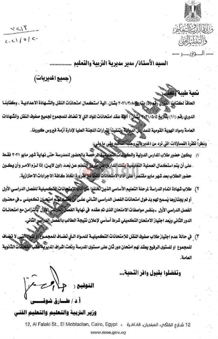 وتابعت الوزارة، في خطابها، أنه في حالة عدم اجتياز طلاب صفوف النقل للامتحانات التكميلية للمواد التي تضاف للمجموع أو المواد التي لا تضاف للمجموع أو المستوى الرفيع يعقد لهم امتحان دور ثان على مستوى المدرسة وتحت إشراف المديرية عقب امتحانات الثانوية العامة.