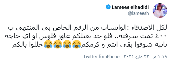 وقال الحديدي في منشورها: “لكل الأصدقاء الواتساب من الرقم الخاص بي المنتهي بـ400 تمت سرقته، فلو حد بعتلكم عاوز فلوس او أي حاجه تأنيه شوفوا بقي انتم و كرمكم.. خللوا بالكم”.