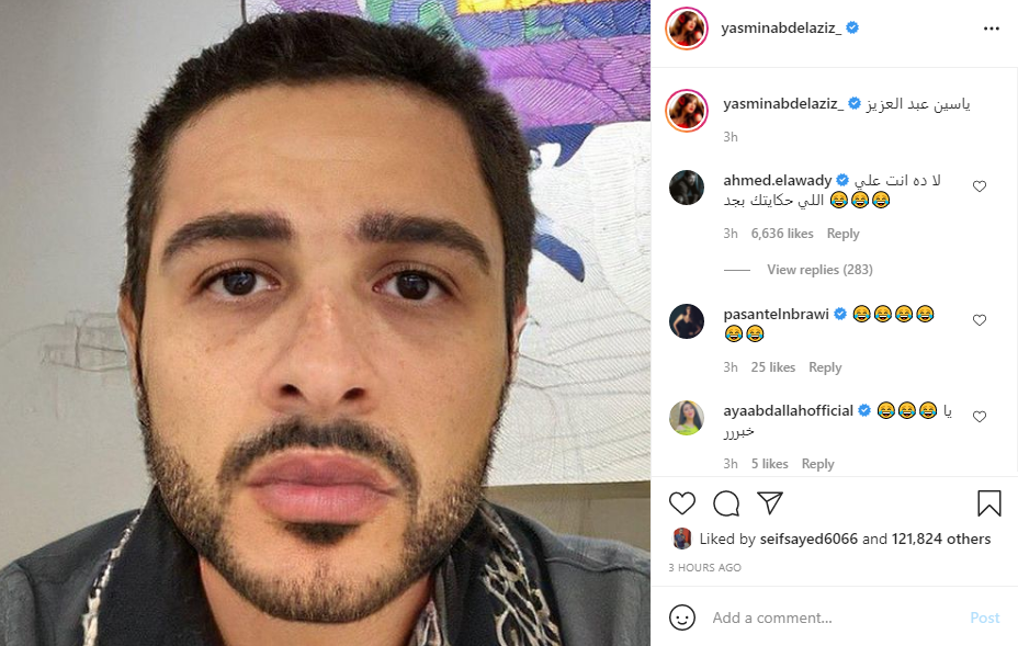 ونشرت ياسمين عبد العزيز، صورة لها بالفلتر الجديد، عبر حسابها الشخصي بموقع تبادل الصور والفيديوهات القصيرة “انستجرام”، وقالت: “ياسمين عبد العزيز”، ليعلق زوجها أحمد العوضي على المنشور قائلاً: “لا ده أنت علي الله حكايتك بجد".