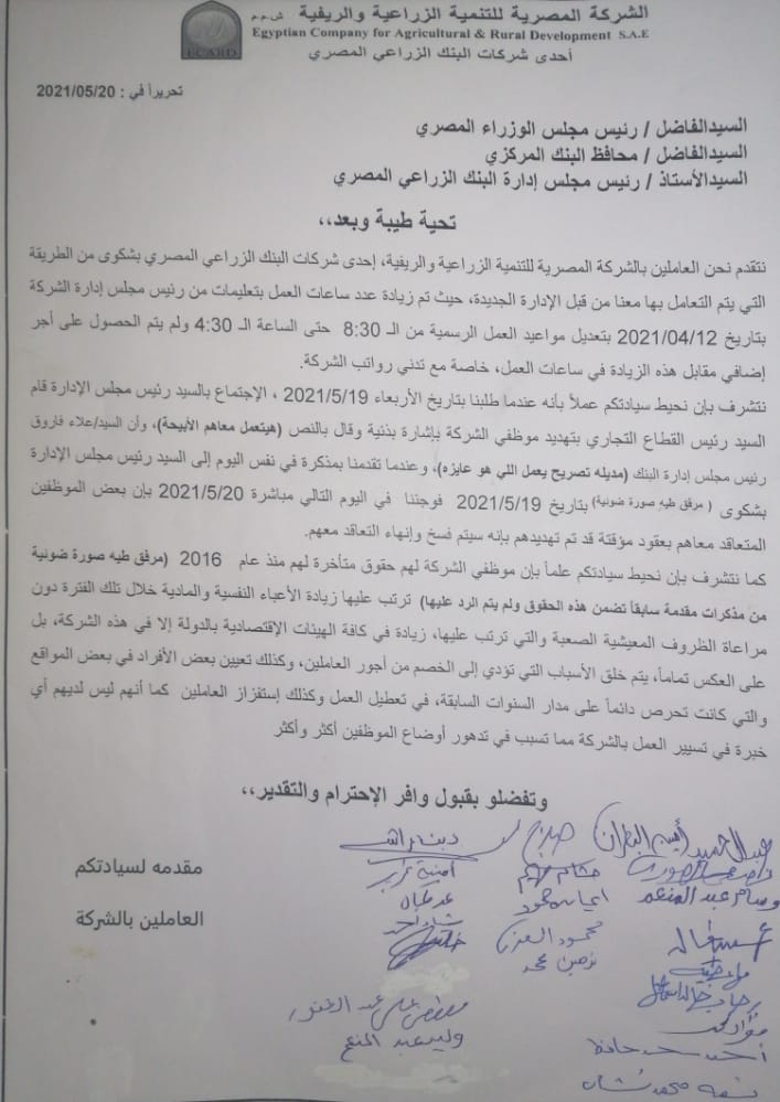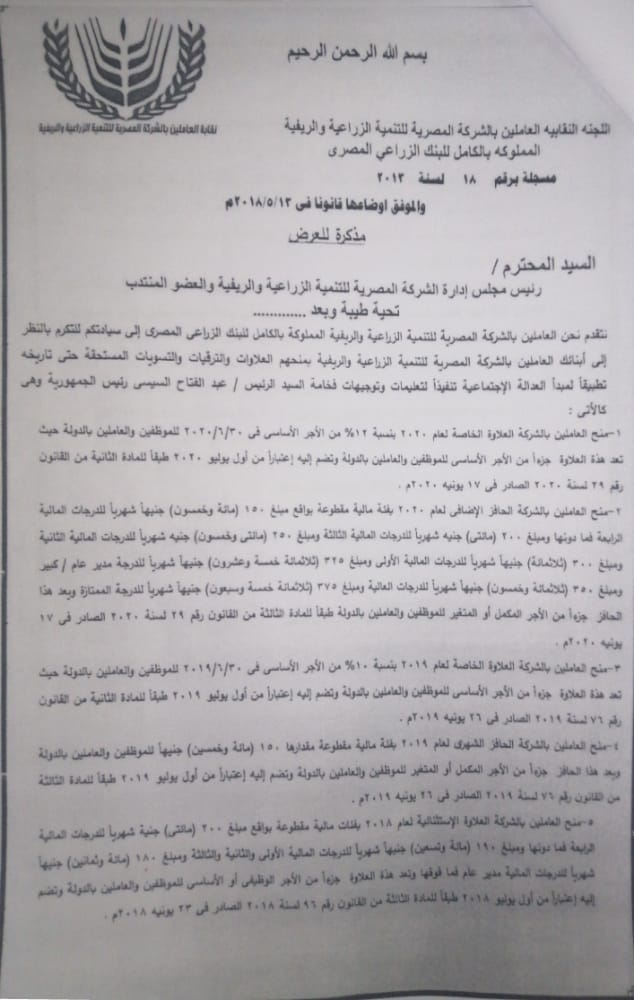 اللجنة النقابية بالشركة المصرية للتنمية الزراعية تطلب صرف حقوق العمال المتأخرة (مستندات)