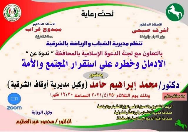 أعلن الدكتور ممدوح غراب، محافظ الشرقية، تنظيم مديرية الشباب والرياضة بإشراف الدكتور محمود عبد العظيم، وكيل وزارة الشباب والرياضة بالشرقية، بالتعاون مع لجنة الدعوة الإسلامية بالمحافظة، ندوة دينية لتوعية بمخاطر الإدمان وتهديدها لاستقرار الأمة.