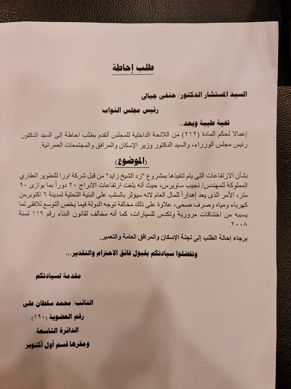تقدم النائب محمد سلطان علي، عضو مجلس النواب، بطلب إحاطة عن ارتفاعات الأبراج التي يتم تنفيذها بمشروع "زد الشيخ زايد" من قبل شركة “أورا” للتطوير العقاري المملوكة للمهندس نجيب ساويرس.