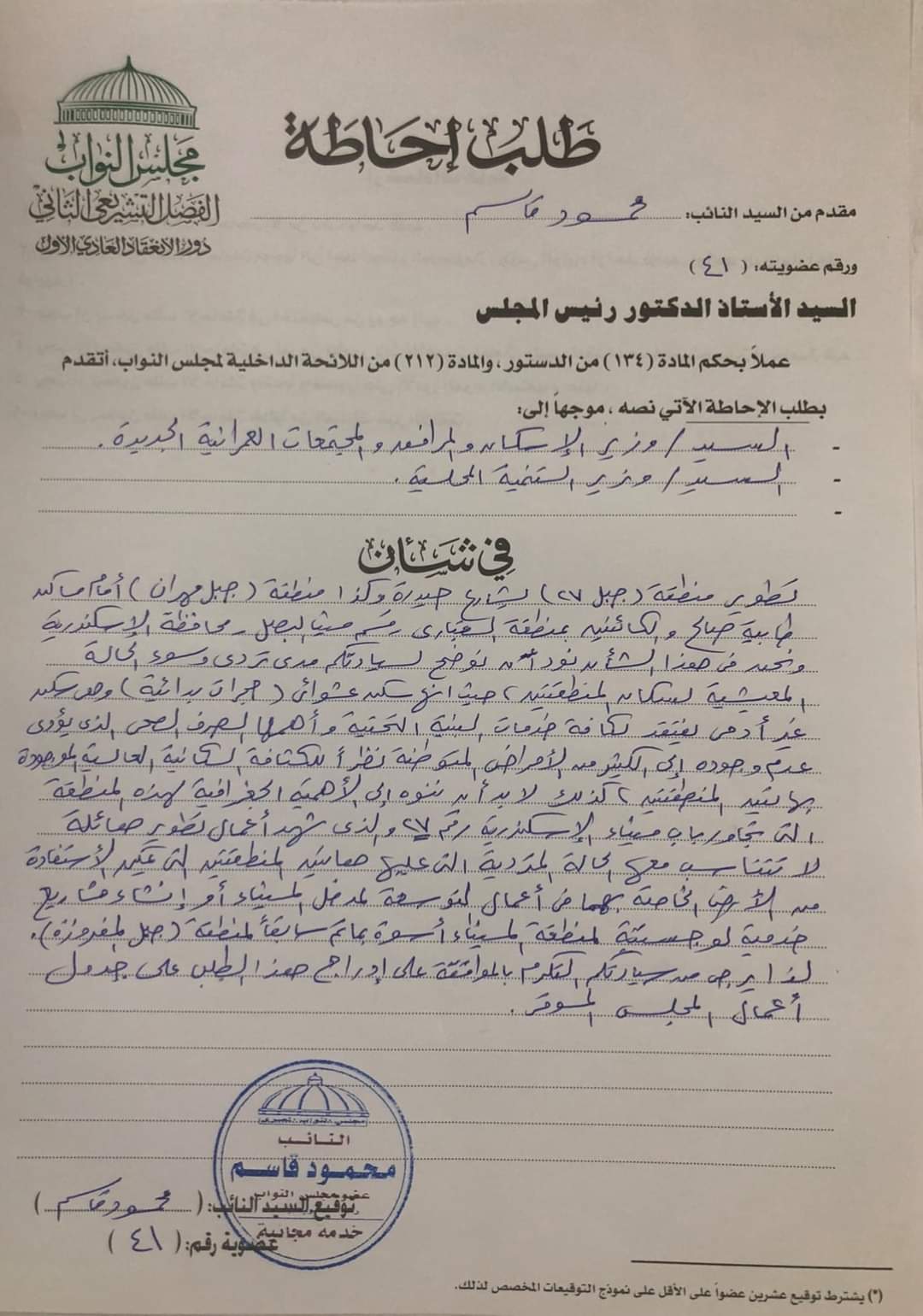 تقدم محمود قاسم؛ عضو مجلس النواب عن الإسكندرية، بطلب إحاطة إلى المستشار حنفي جبالي رئيس مجلس النواب، لتوجيهه إلى الدكتور عاصم الجزار وزير الإسكان والمرافق والمجتمعات العمرانية الجديدة، واللواء محمود شعراوي وزير التنمية المحلية، بشأن أوضاع منطقتي جبل 27 وجبل مهران.