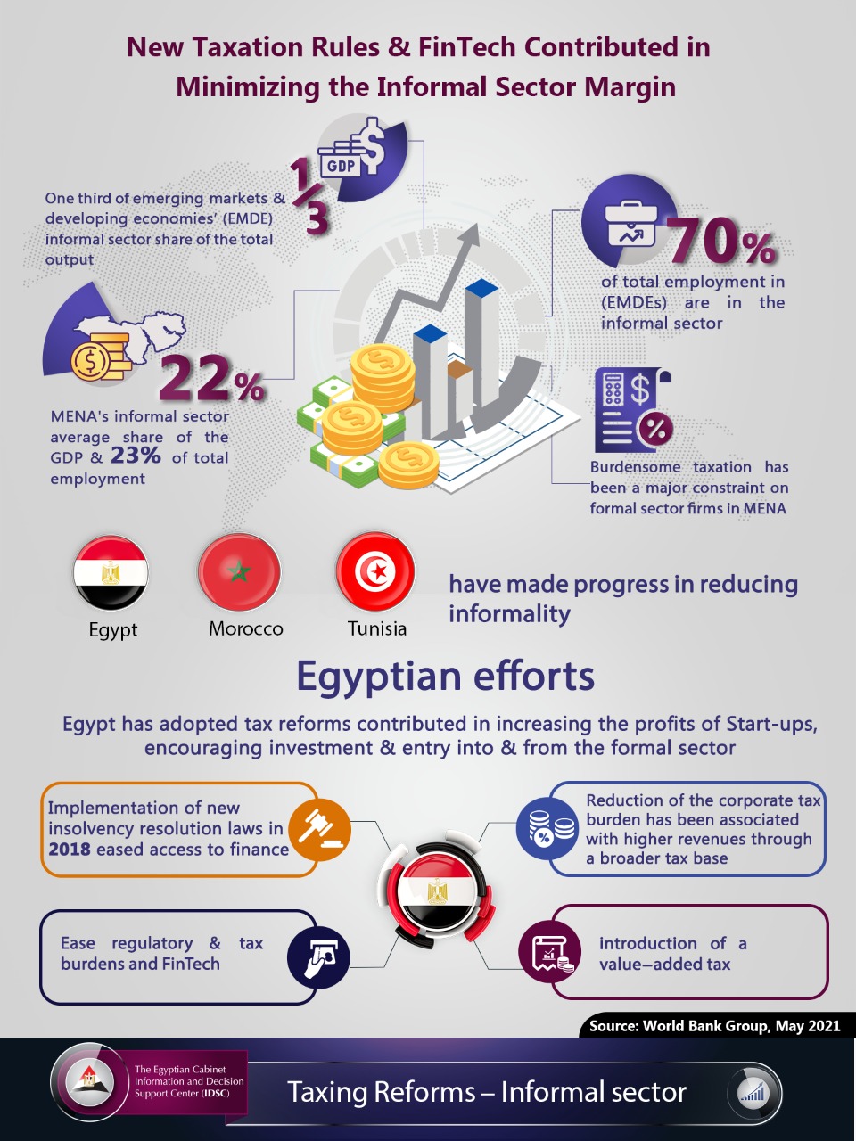 وجاء في التقرير أن دول الشرق الأوسط وشمال إفريقيا تعاني كبر حجم هامش اقتصاداتها غير الرسمية، وقد برزت عدة دول تعمل جاهدة لتحديد هذا الهامش، ومنها مصر، والتي أكد التقرير تبنيها إصلاحات ضريبية وتسهيلات في الإجراءات أثبتت نجاحها عالميًّا، وقامت على توفيقها مع الوضع المحلي.