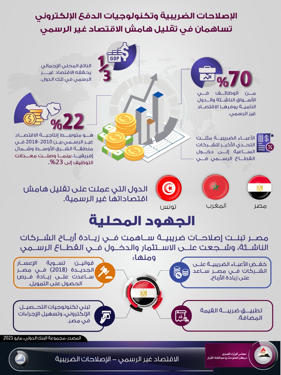 الوزراء: الإصلاحات الضريبية وتكنولوجيات الدفع الإلكتروني تساهمان في تقليل هامش الاقتصاد غير الرسمي (انفوجراف)