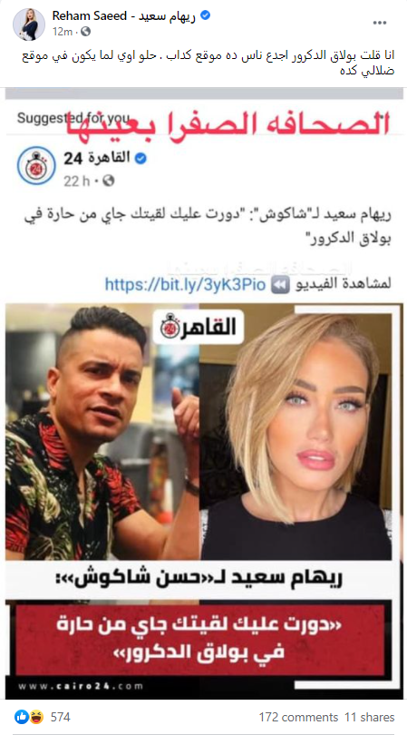 ونشرت “سعيد”، عبر حسابها الرسمي على موقع التواصل الاجتماعي “فيس بوك”، “سكرين شوت” من خبر يتضمن أزمتها مع المطرب الشعبي حسن شاكوش، وعلقت عليه قائلة: “أنا قلت بولاق الدكرور أجدع ناس.. ده موقع كداب حلو أوي لما يكون فيه موقع ضلالي كدا”.
