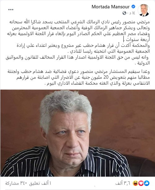 علق مرتضى منصور رئيس مجلس إدارة نادي الزمالك السابق، على القرار الصادر من قبل القضاء الإداري بإلغاء قرار إيقافه عن مزاولة أي نشاط رياضي لمدة 4 سنوات.