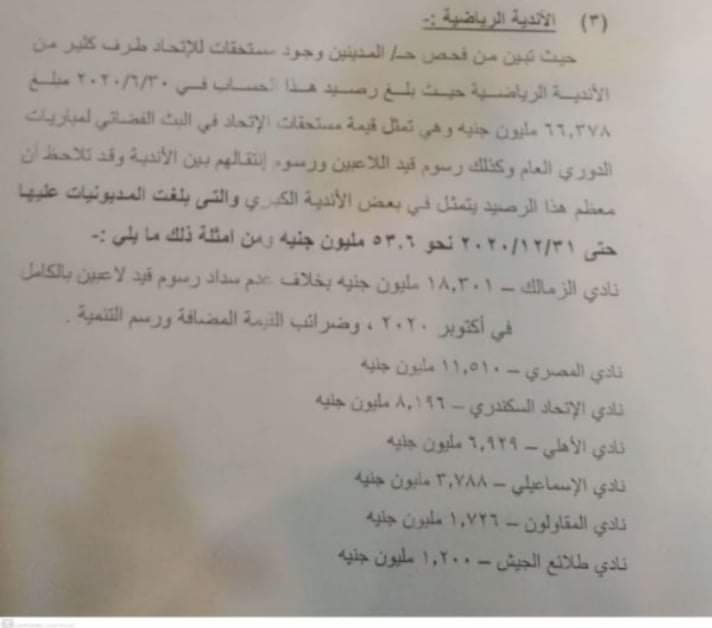 وفي تقرير سري تم رفعه إلى أحمد مجاهد رئيس اللجنة الثلاثية التي تدير اتحاد الكرة، فإن الأندية بأكملها في القسم الأول وحتى القسم الرابع تصل إجمالي مديونياتهم 66 مليون جنيه مصري، في حين بلغت حصيلة الأندية الكبرى 53 مليون.