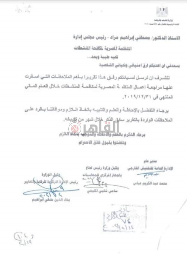 وأجرت وزارة الشباب والرياضة التفيش على المنظمة في آخر عام 2019 وبداية عام 2020 حتى بداية السنة المالية الجديدة في يوليو 2020.