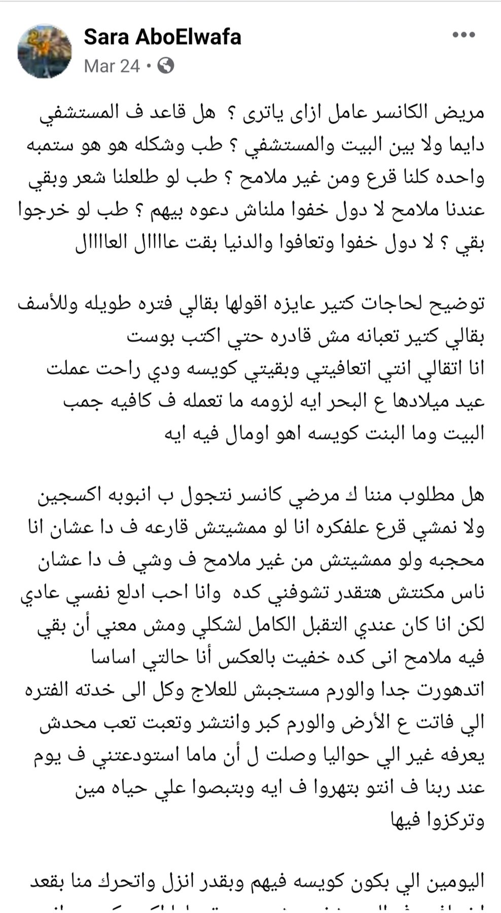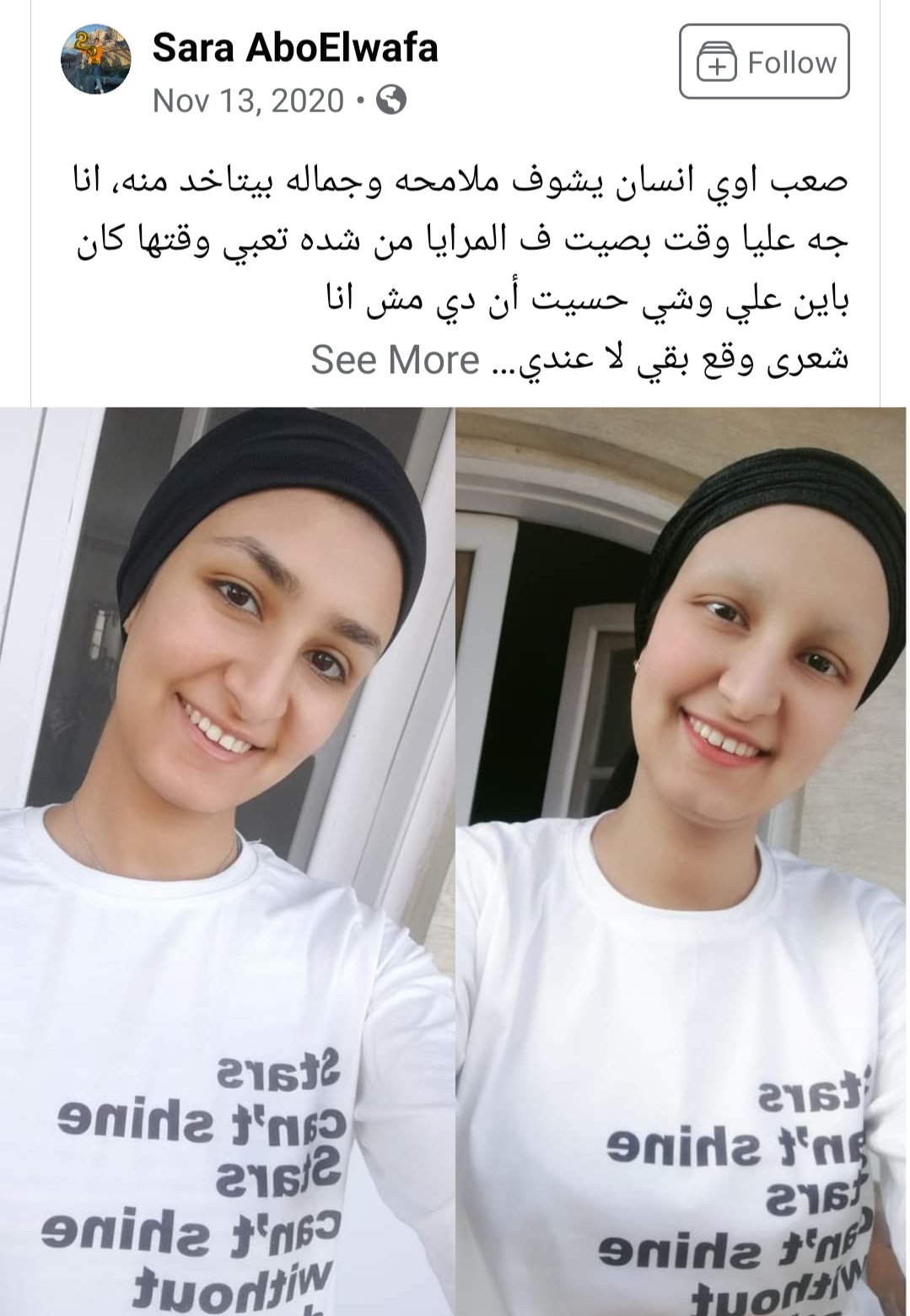 "صعب أوي إنسان يشوف ملامحه وجماله بيتاخد منه، أنا جه عليا وقت بصيت في المرايا من شدة تعبي وقتها كان باين على وشي، حسيت أن دي مش أنا.. شعرى وقع بقي لا عندي رموش ولا حواجب ولا أي ملامح، وكتير أنام وأحلم أني بلعب بشعرى وأصحي حاطة أيدي علي دماغي وملاقيش حاجة، ومتتخيلوش دا بيوجع القلب إزاي".. هذه العبارة كانت ضمن المنشورات المؤثرة التي تعتبر خاطرة نشرتها سارة عبر صفحتها الشخصية بموقع التواصل الاجتماعي "فيس بوك".